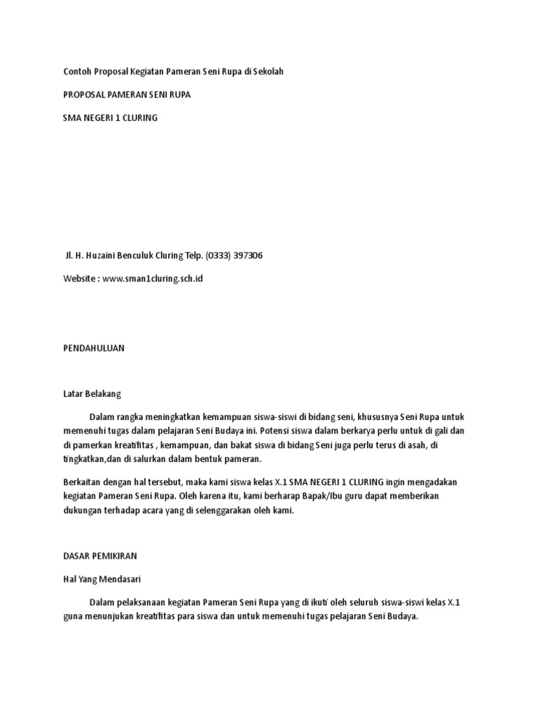 Contoh proposal seni budaya ( pameran seni ). Kami sengaja membuat proposal ini sebagai bentuk untuk menggambarkan rancangan kegiatan pameran seni rupa yang akan kami selenggarakan. Proposal merupakan sejenis laporan yang isinya mengenai rancangan untuk membuat rancangan secara parti terkait rincian acara di dalam suatu file atau data yang. Alhamdulillah, segala puji dan syukur kami panjatkan kepada allah tuhan yang maha esa, yang telah memberikan berkat, rahmat, hidayah. Dina arini zahra galuh andina safitri gusti indah m.p.